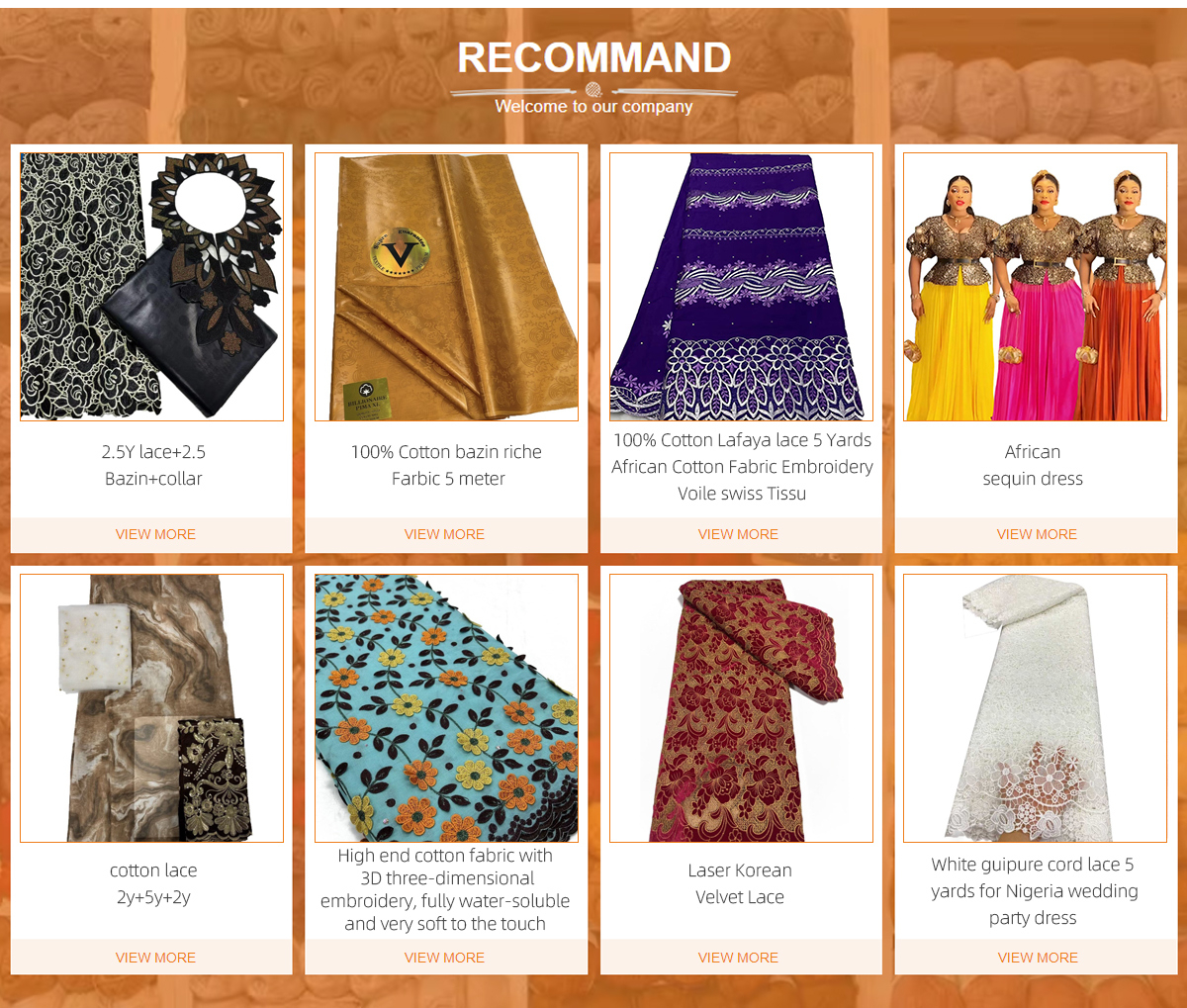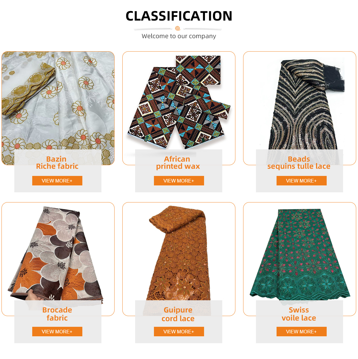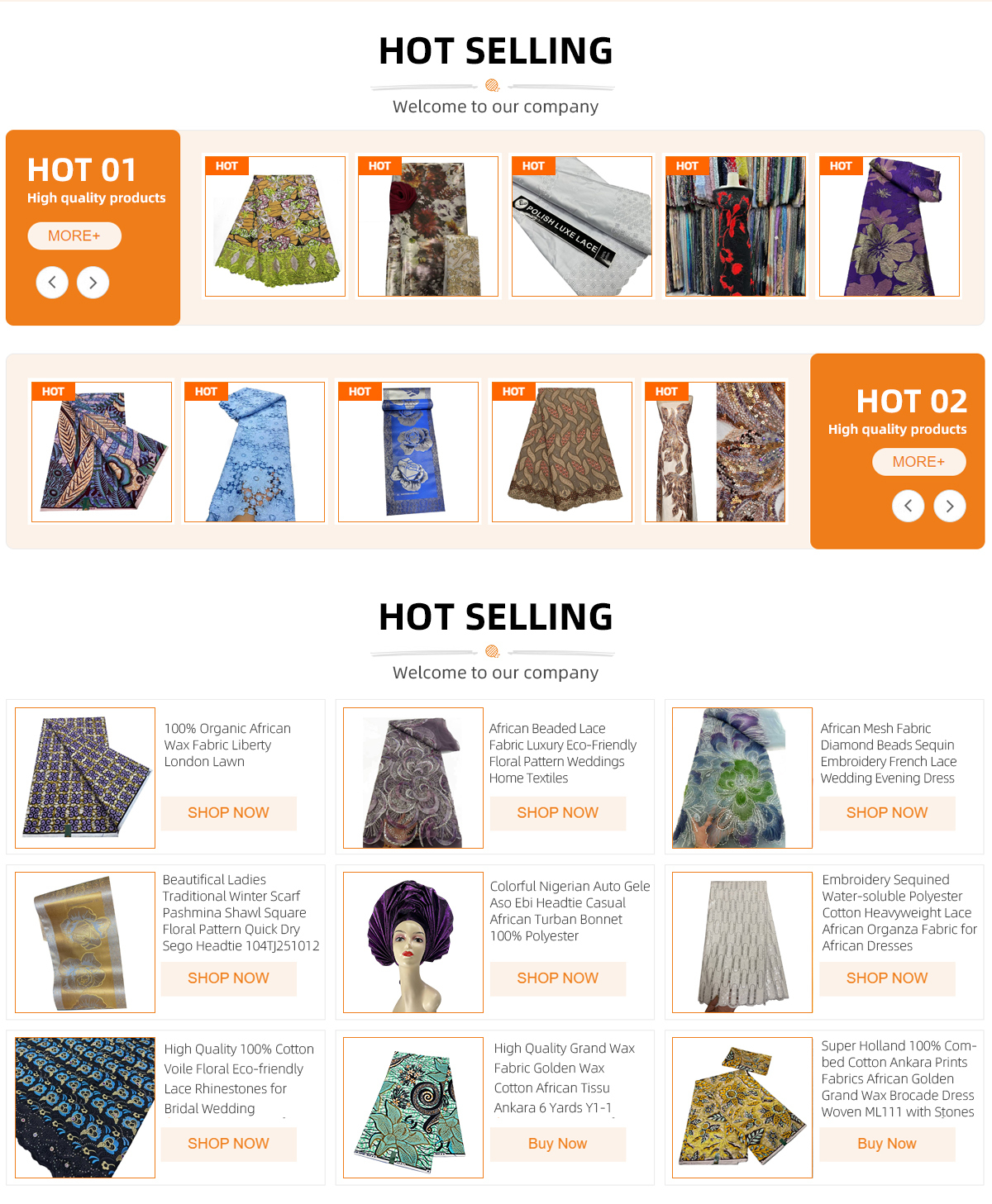 Produk utama: Lilin cetak, renda Afrika, ikat kepala, gaun jubah abaya Afrika, kain satin